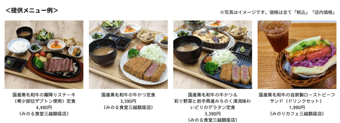 期間中、みのる食堂では国産黒毛和牛を使用した「ステーキ(希少部位ザブトン使用)定食(数量限定)」「牛かつ定食」、みのりカフェでは「ローストビーフサンド」を提供します。
