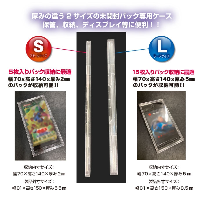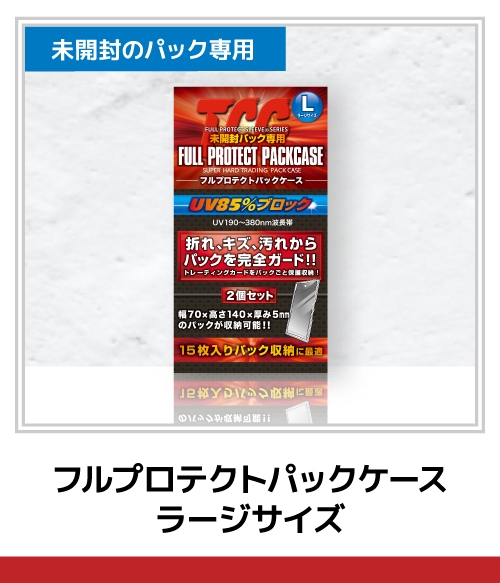 フルプロテクトパックケースは、未開封パックを収納可能です。5枚入りパックの厚みに対応したスモールサイズと15枚入りパックの厚みに対応したラージサイズの2サイズ展開です。