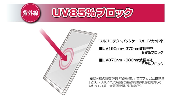 フルプロテクトパックケースはUV190nm~370nmすべての波長帯を99%カット、UV370nm~380nmの波長帯を85%カットします。