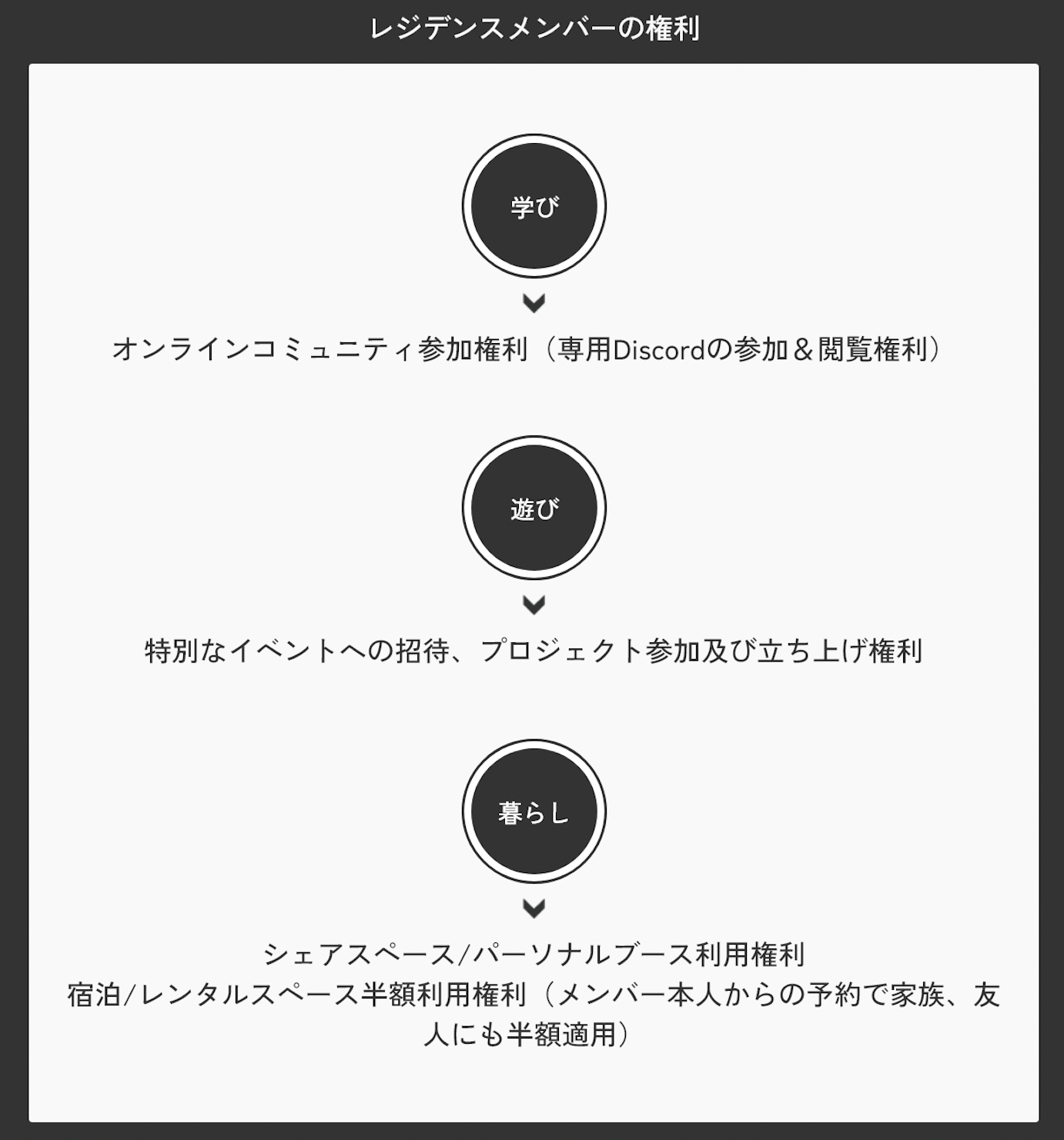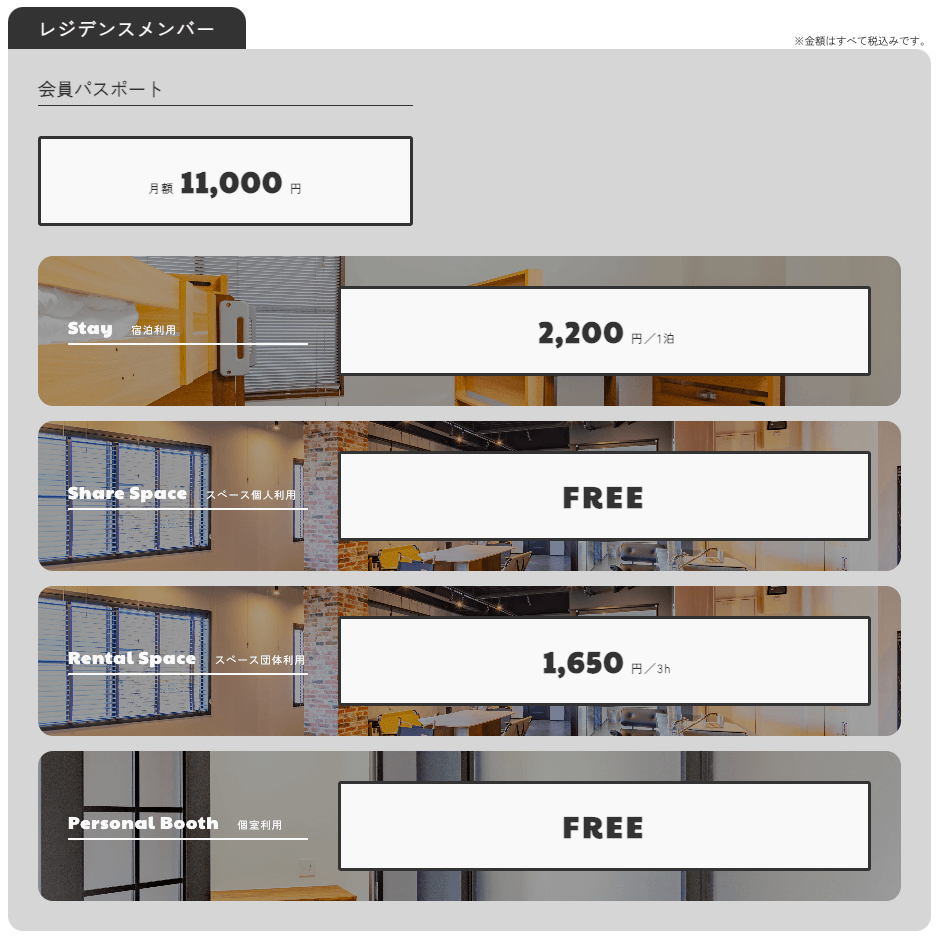 レジデンスメンバーは会員パスポート(月額11,000円)を購入し、「学び・遊び・暮らし」に紐づいた権利を得ます。