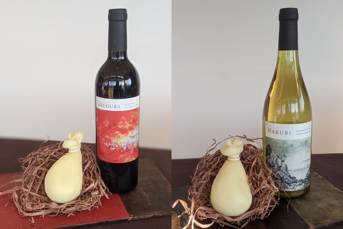 ワインの種類は赤ワイン『QAUGURA 2019 Sangiovese』750ml、白ワイン『HAKUBI 2019 Chardonnay』750mlの2種類からお選び頂けます。