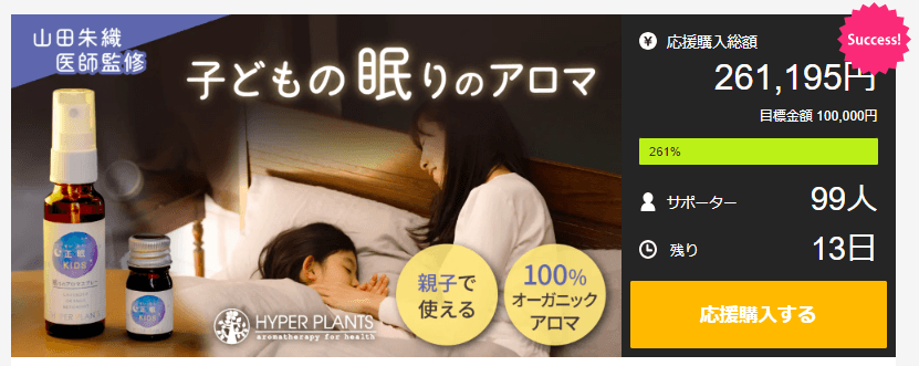 子どもの眠りのために開発したオーガニックアロマ『正眠KIDS』、 7月のプロジェクト開始から約一か月で目標金額の261%達成! 8月20日18時まで先行販売中