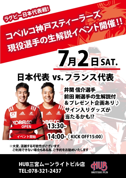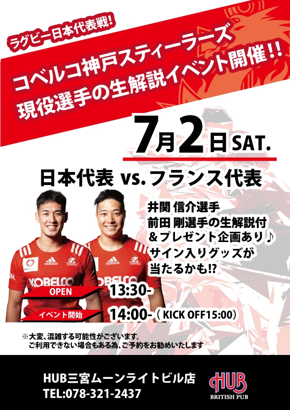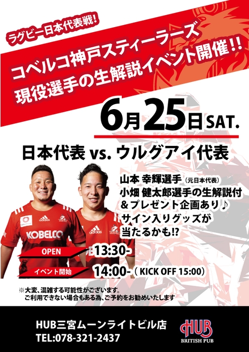 株式会社ハブ(本社:東京都千代田区、代表取締役社長:太田 剛)が運営するHUB三宮ムーンライトビル店は、コベルコ神戸スティーラーズの現役選手による、ラグビー日本代表戦のリアルタイム解説イベントを開催いたします。