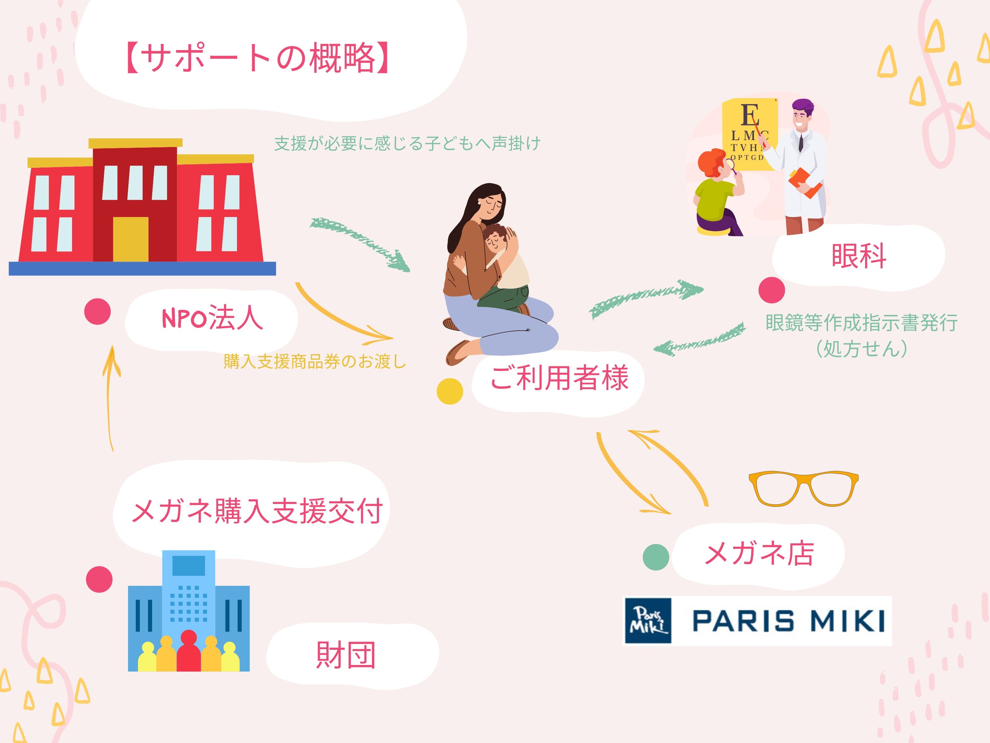 各NPO法人が「見えにくい」を感じている子ども達へ声掛けをし、商品券の交付、利用しやすい環境を構築。財団とNPO法人とメガネ店が連携したサポートを行います。