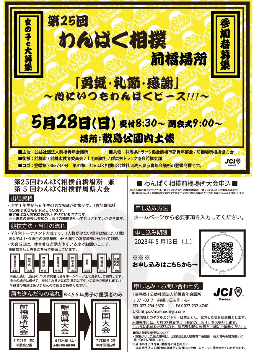 公益社団法人前橋青年会議所(所在地:群馬県前橋市日吉町181 マックスクエア 前橋商工会議所会館4F、理事長:石井 祐樹)は、「第25回わんぱく相撲前橋場所」を敷島公園土俵にて2023年5月28日(日)に開催します。