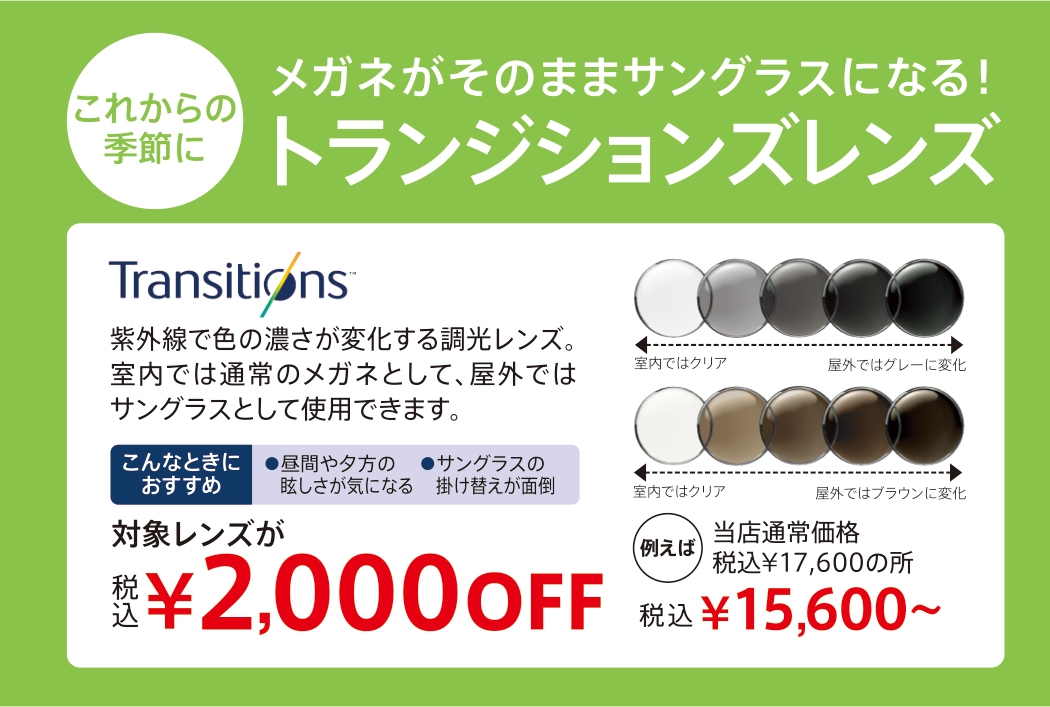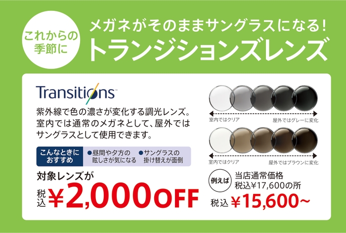 メガネがそのままサングラスになる!トランジションズレンズが期間限定で¥2,000 OFF!まぶしさは抑えたい、でもサングラスへの掛け替えが面倒、という方は是非一度お試しください。
