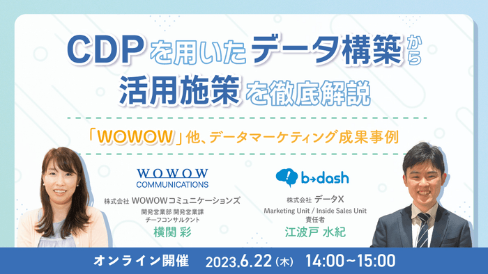 株式会社WOWOWコミュニケーションズ(本社:神奈川県横浜市、代表取締役 社長執行役員:山崎 一郎)は、2023年6月22日(木)に、株式会社データX様(本社:東京都新宿区、代表取締役社長:安部 泰洋)と共催セミナー『CDPを用いたデータ構築から活用施策を徹底解説 ~「WOWOW」他、データマーケティング成果事例~』を開催いたします。