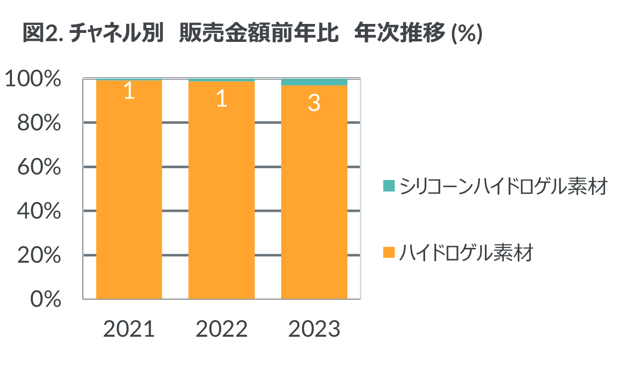 眼の健康に良いとされる、シリコーンハイドロゲル素材の新製品発売が続いている。従来のハイドロゲル素材よりもプレミアムな素材・価格としてクリアレンズでは一般的な素材となっているが、カラー・サークルレンズ市場ではまだその規模は小さく、製品数も少ない。一方で、人気製品シリーズから新たにシリコーンハイドロゲル素材のタイプが発売されるなど、製品のラインナップ拡大の動きが見られている。素材別の金額構成比を見ると、ハイドロゲル素材が主流であることは変わらないが、徐々にシリコーンハイドロゲル素材の構成比が増加している(図2)。カラー・サークルレンズにおいても定着していくのか今後が注目される。