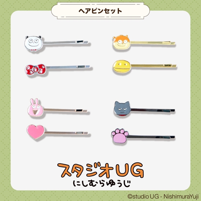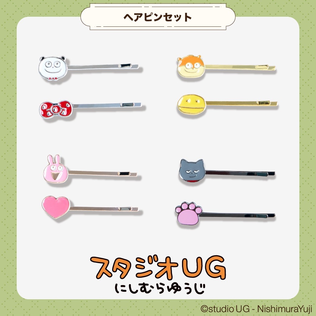 大人気クリエイター・にしむらゆうじが描くキャラクター(ごきげんぱんだ・こねずみ・ラブラビット・わるめのねこ)をモチーフにした、愛らしさ満点のヘアピンセット。