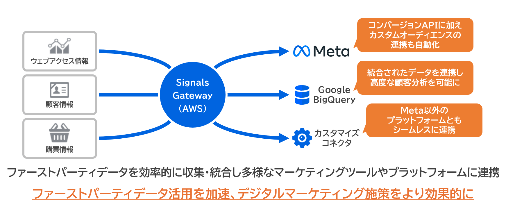 このソリューションは、ファーストパーティデータの効率的な収集・統合、多様なマーケティングツールやプラットフォームへの連携を支援します。