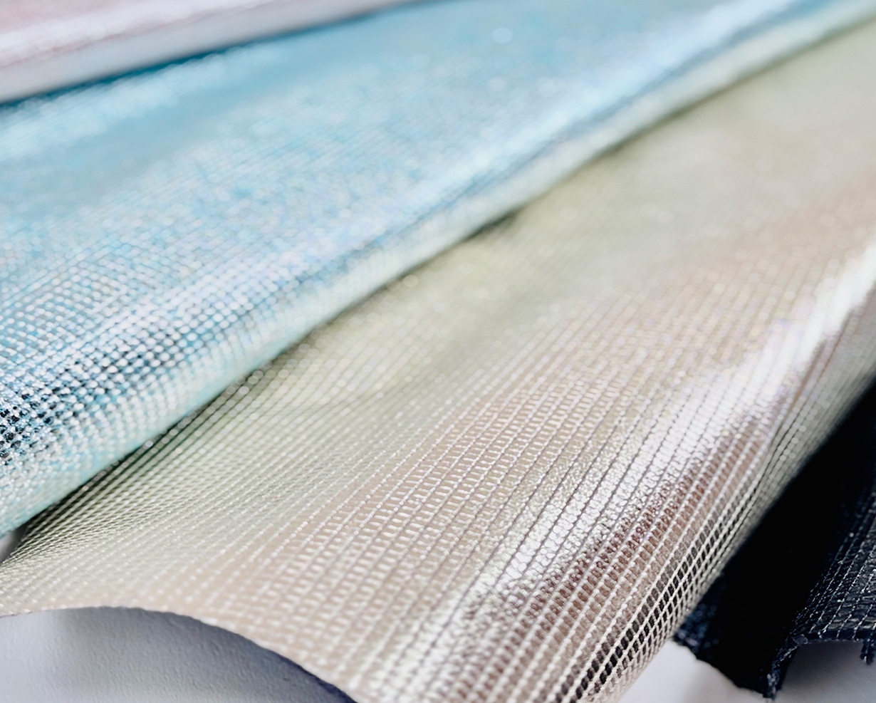丈夫で軽量なゴートレザー(山羊革)を染色し、その上に、光る箔を貼り付け、さらに型押し加工を施すことで、光のプリズムのように、美しい輝きを放ちます。