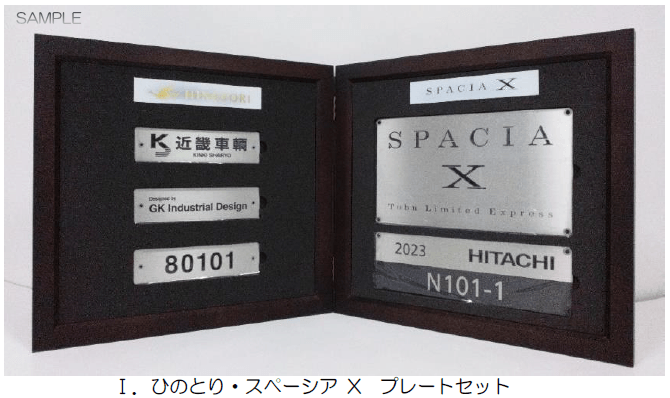 6.内容 「ひのとり」と「スペーシア X」の第一編成に掲出されている「80101」・「N101-1」車両プレート(レプリカ)の原寸大サイズです。近鉄版と東武版があり、近鉄版には実際に「ひのとり」車内で使用していたレギュラーシートの枕カバー(洗浄済)1枚を、東武版には「スペーシア X」のスタンダートシートの枕カバー(未使用)1 枚を同封しています。販売数は近鉄版・東武版がそれぞれ50個で、各セットには、背面にシリアルナンバーを割り振っています。シリアルナンバーは、近鉄版がK-HV01~K-HV50、東武版は N101-01~N101-50 です。(プレートのナンバーはシリアルナンバーに関わらず、写真の通りです。)