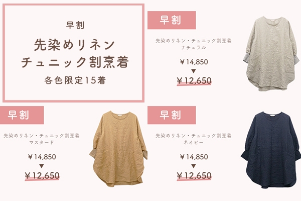 汚れの落ちやすいリネン、そして腕まくりしても落ちてこないリブ袖の割烹着で機能性もよく、お洋服としても使えるデザインが毎日をたのしく、これからやってくる年末年始のお掃除にも活躍してくれます。冬のお出かけコーデにも映える大人可愛いマスタードも登場し、お家時間もお出かけ時も気分を高めてくれること間違いなしです。