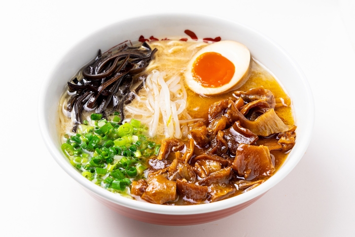 自家製の甘辛ダレでじっくりと煮込んだ牛すじ肉をたっぷりとトッピング!牛すじの旨みと甘辛いタレがスープに溶け込んだ極旨な逸品です。