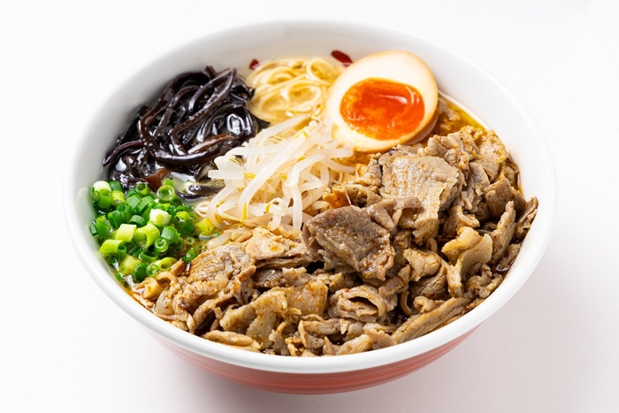 特製のタレでじっくりと煮込むことで、ピリッとした辛さの効いた豚バラ肉を贅沢にトッピング!これまでにない全く新しい逸品です。