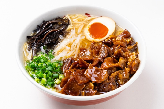 自家製のタレでじっくりと煮込んだ牛すじから漂う甘辛いタレの香りとスープに溶け込むことで、豚骨スープに牛すじに旨味がしみ込んだ絶品メニュー!