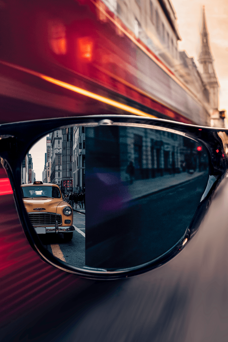 HINDSIGHTのサングラスは、独自のミラー機能を搭載しており、前方視界と後方視界を同時に確保することができます。これにより、前を向いたままでも常に自分の後ろの交通状況を把握することができ、自動車の接近などにいち早く気付くことができます。