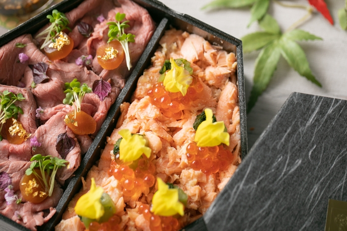 “鮭おこわ”と“ローストビーフ丼”の2種類が楽しめる特製弁当。鮭おこわは日本人におなじみの“鮭”を使い西京味噌と絡める事で甘味と旨味が鮭本来の味を最大限に引き出します。さらに秋に旬を迎える“いくら”を仕上げに盛り合わせることで濃厚な甘味を感じる事ができる贅沢逸品に。