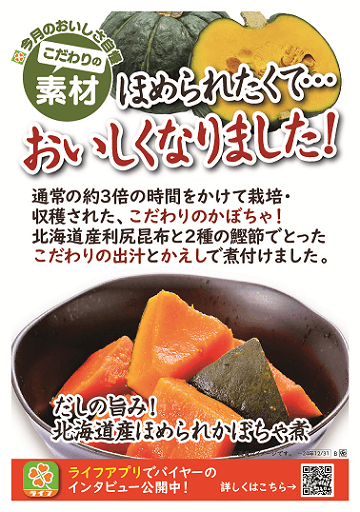 “おいしい” “ワクワク” “ハッピー” をお届けするライフコーポレーションは、惣菜とインストアベーカリー“小麦の郷”の12月の「おいしさ自慢」商品として、「だしの旨み!北海道産ほめられかぼちゃ煮」と「マルゲリータ」をリニューアルいたしました。