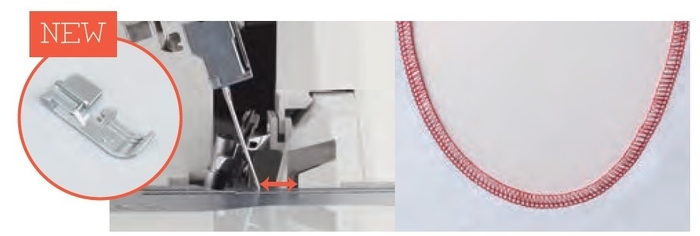 (2)小回り押えの新設により、布押えの面積が小さくなり、カーブ縫いなど、ハンドリングが自在にできるようになります。