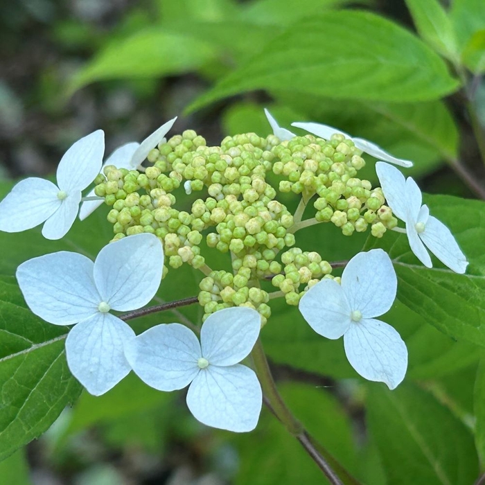 現在、「深山八重紫」「七段花」が咲き始めました。「紅てまり」や「紅やま」は形はできてきましたが、装飾花の部分が色づくのはこれからです。