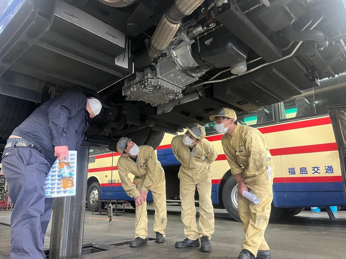 2023年8月に初めて、アリソンTモデルを搭載したジェイ・バス製中型路線バスを導入した福島交通株式会社、輸送安全部 次長 車両整備統括責任者の岡崎 一雄氏は、「県内外の他のバス事業者からアリソン製AT車のスムースな走行性能の高さやドライバーのストレス軽減といったメリットを耳にし、国内の大型路線バスに普及している搭載実績と合わせ、安心して導入することができました。一方、ATが故障した際の対応を心配していましたが、導入後には郡山市のアリソンサービスディーラーである三信精器工業とメンテナンスセミナーを共同開催することで、自社で行える定期的なメンテナンスへの理解が深まりました。不測の事態に備え、我々の近くにサービス拠点があることも安心材料となっています」と述べています。また、郡山支社 車両整備課 係長(船引営業所担当)の塚原 康裕氏は、「セミナーではATFの過不足が変速ショックの発生やブリーザーからの油漏れにつながることを理解できました。また実際に車両を使ってATFとフィルターを交換し、適量のATFを充填するためのレベルゲージによる「COLD」と「HOT」チェックの必要性と手順を改めて確認できました。」と述べています。事業者に対するメンテナンスセミナーを通じて、アリソン製品への理解を促進し、長期間にわたってご愛用いただけることで、サステイナブルな社会構築の一助になるとともに、マニュアル車では必要なクラッチ交換が不要となり、長期間にわたるトータルのメンテナンスコストの削減を図ることにもつながっています。