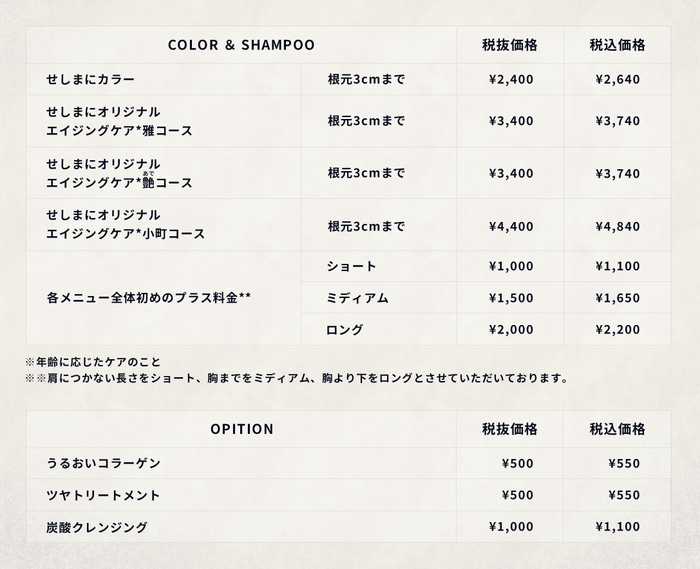 *白髪染めもオシャレ染めも同じ料金です。