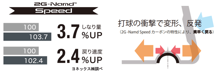 ※ Namd™及び2G-Namd™は、ニッタ㈱が開発した「ナノ分散カーボンナノチューブを炭素繊維へ均一複合化」する技術です。2G-Namd™ SpeedはNamd™の CNT 層構造を 3 次元構造へと進化させた 2G-Namd™を適用することにより、変形からの復元力が飛躍的に向上しました。Namd™及び2G-Namd™はニッタ㈱の日本における登録商標です。