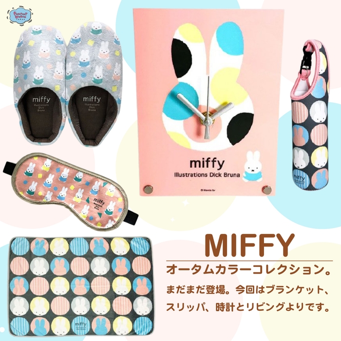 話題のミッフィーのオータムシリーズから、新しいアイテムのお知らせです。これからの時期に活躍してくれるブランケットやスリッパから、キュートな置時計などのインテリアアイテムも揃いました。