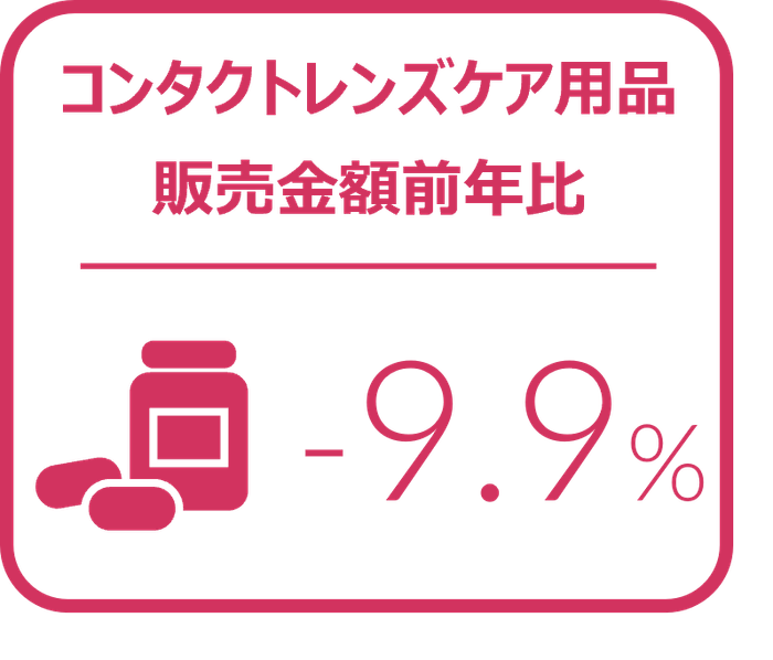 2023年第4四半期(10‐12月)のコンタクトレンズケア用品の販売は、金額前年比9.9%減とマイナスで推移した。店頭では6.9%減、インターネットは12.7%減となり、第3四半期に続いてインターネットの減少幅が店頭を上回った。