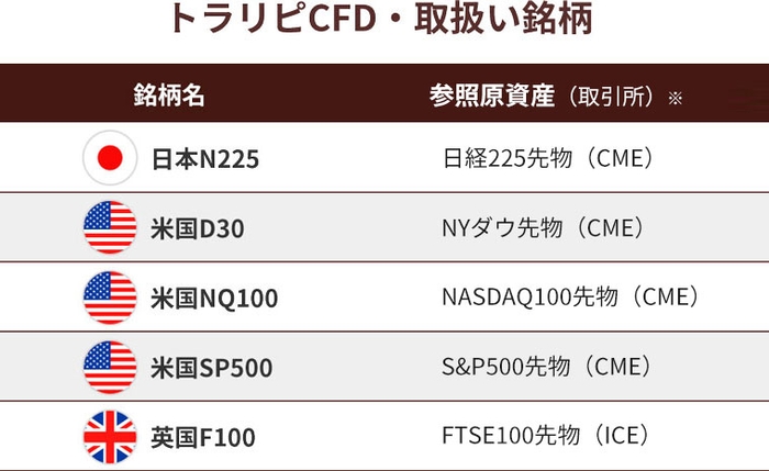 ※原資産とは:FXやCFDなどのデリバティブ商品における、主に値動きの対象となる金融マーケットを指す言葉。たとえば、日本N225ならCME(シカゴ・マーカンタイル取引所)の日経225先物を原資産としており、その変動を基に日本N225の変動が生成される仕組み。
