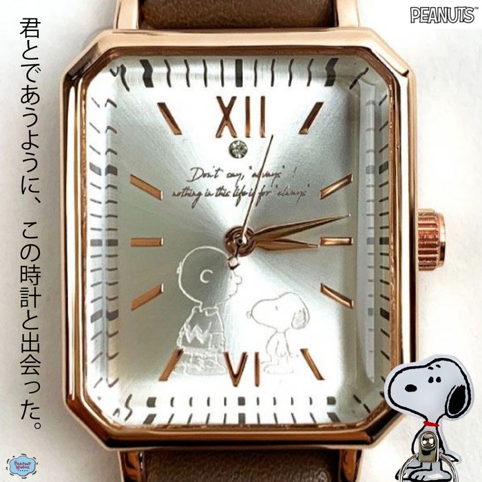 こちらの文字盤には、スヌーピー&チャーリーブラウンがデザインされています。先程と同じくピンクゴールドで、大人の女性にピッタリ。