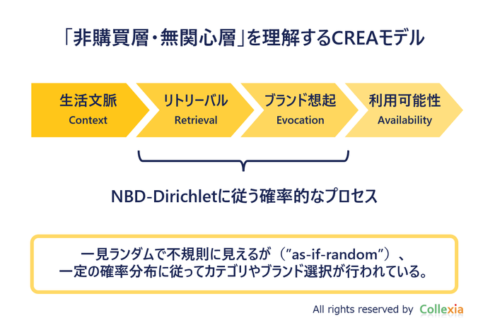 未顧客は、長らく企業のマーケティング活動の外側に置かれてきました。データが無い上、移り気で不規則な消費行動を繰り返しているだけで、ターゲティングできないと思われてきたからです。しかし、近年の研究により、一見ランダムに見える未顧客の購買行動には一定の規則性があり、Dirichletという確率モデルで説明されることが明らかになりました※。こうした知見をブランド戦略やマーケティング施策の開発に生かすため、コレクシアは、無関心が関心に変わり購買に至るプロセスを理解する「CREA(クレア)モデル」を開発しました。