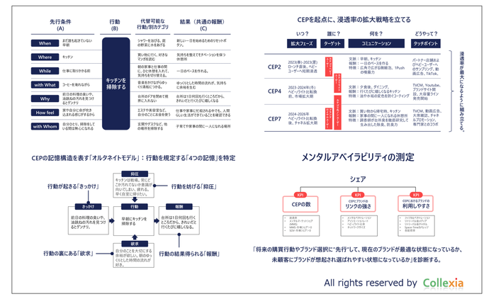 非購買層と向き合い事業をスケールするためには、CREAモデルに則った顧客理解とブランド管理が求められます。特に、生活文脈に合わせてブランドを再解釈すること、日常生活の中に“ブランドとの記憶接点”を作ることがマーケティングの重点になります。コレクシアは、そうした原理原則に基づいて新規獲得や市場拡大を支援する分析ソリューションとコンサルティングを提供します。