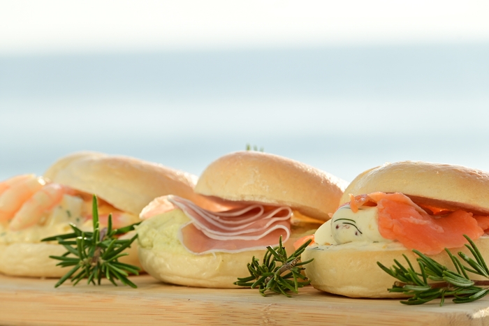味はスモークサーモンとディル入りクリームチーズベーグル、生ハムとアボカド入りクリームチーズベーグル、海老とたまごタルタルベーグルの3種類をご用意しております。