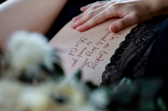 大きくなったお腹にマタニティペイントを施して赤ちゃんへのメッセージを添えて撮影される方もいらっしゃいます。実際にスタジオでボディーペイントを行っているわけではないですが、今ではペイント用のボディーシールもあるのでご興味のあるかたはぜひご検討ください。