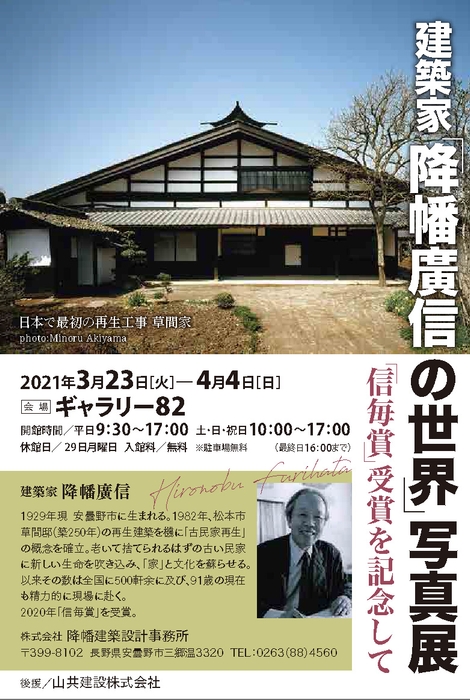 古民家再生の第一人者として、全国で500軒余を再生させてきた降幡氏の原点でもある「草間邸」をはじめ、その後の代表作の写真が年代を追って展示されます。「古民家再生」を確立させた降幡氏の足跡がわかる写真展ですので、お近くの方はぜひ足をお運びください。