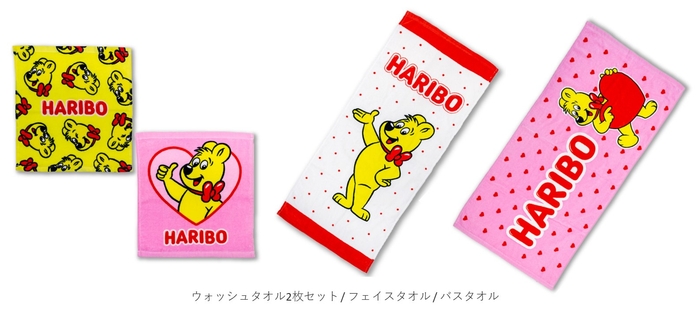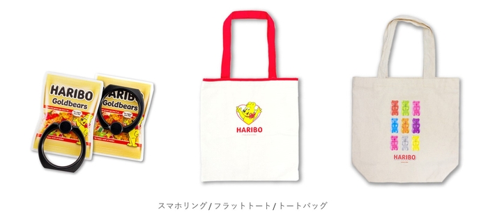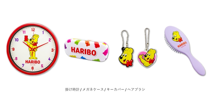 まるで本物のHARIBOグミみたいなキーホルダー、イヤリングや、エコバッグとしても便利なトートバッグ、お家で便利な掛け時計、バスタオル、ヘアブラシまで!