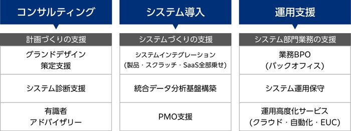 そして各業務領域に対し、「コンサルティング」「システム導入」「運用支援」のサービスを提供できることが特徴です。