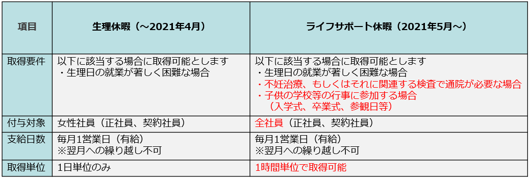 ◇「生理休暇」と新たに導入する「ライフサポート休暇」の比較