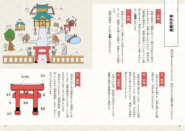 後半では、鳥居や社殿、狛犬、御神体といった神社の建物や、お参りの仕方、お祭りや七五三など、知っているようで知らない神社と日本文化について楽しく学んでいきます。