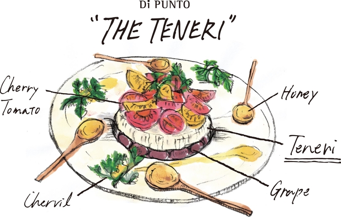 今回ディプントでは、様々な形でチーズ本来の美味しさを堪能して頂けるよう、見た目も可愛い3層のケーキ仕立ての一皿でご用意いたしました。まずは、塩麴でマリネしたチェリートマトと一緒に前菜風で、次に甘い葡萄と合わせてデザート風に、最後はオーガニックはちみつをかけて味の変化をお楽しみください。合わせる食材によって、何度も感動が味わえるテネリは、きっとあなたのリコッタチーズの印象を覆す、特別な一皿になると思います。