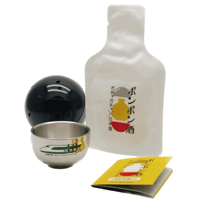 ポンポン酒とは日本酒とお猪口が入ったガチャで、株式会社FARM8と株式会社ドッツアンドラインズ(新潟県三条市)らとのコラボ企画で実現したもの。ガチャを回すと上越新幹線が描かれた磁器やステンレス、鎚起銅器のお猪口と新潟県内の日本酒がランダムに当たる仕組みになっています。