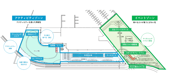 ビードは「目的地にも立ち寄り地にもなれるキャンプ場」という事業コンセプトを基に、大阪湾のランドマークとしてヨットマン以外の来客需要も多いオートキャンプ場をはじめとした施設が楽しめる「アクティビティゾーン」と、地域のにぎわいとなるような様々なイベントを開催する「イベントゾーン」の2つを展開予定です。臨港緑地としての機能や利用者の利便性を高める駐車場の整備、飲食・物販等のサービス機能の充実、多種なイベントの開催によって、市民が大阪湾の魅力を体験できる接点を生み出し、にぎわい創出を図った場づくりをめざします。