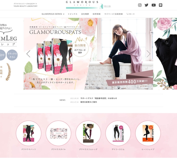 「グラマラスパッツ・ヒートシェイプ」の発売に合わせ、ブランドサイトもリニューアルオープンいたしました。これまで独立していた【ブランドサイト】と【ECサイト】の入口をひとつに集約し、『GLAMOROUS SERIES』(グラマラスシリーズ)の製品ラインナップや各種情報をご覧いただきながら、直感的にショッピングもお楽しみいただけます。