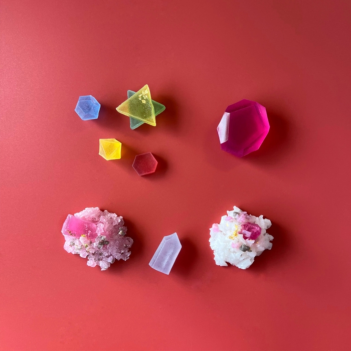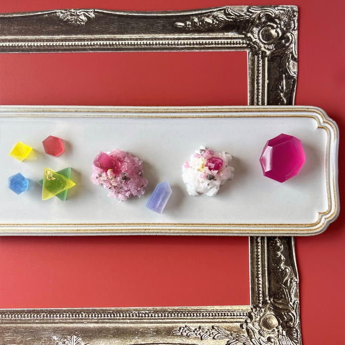ルビーの赤い表現を引き立てるべく、青や赤などの色を使った鉱物も一緒に構成しました。見た目の美しさだけでなく、色ごとに味が違うのも特徴。味も裏切らないを目指した、ハラペコラボの琥珀糖こうぶつヲカシ。青はミント、水色はサイダー、黄色はレモン、緑はラ・フランス、濃い赤はカシス、紫はブルーベリー、黒は黒ゴマとメインのルビーに使われているラズベリーの他にも食べ応えのある構成になっている。