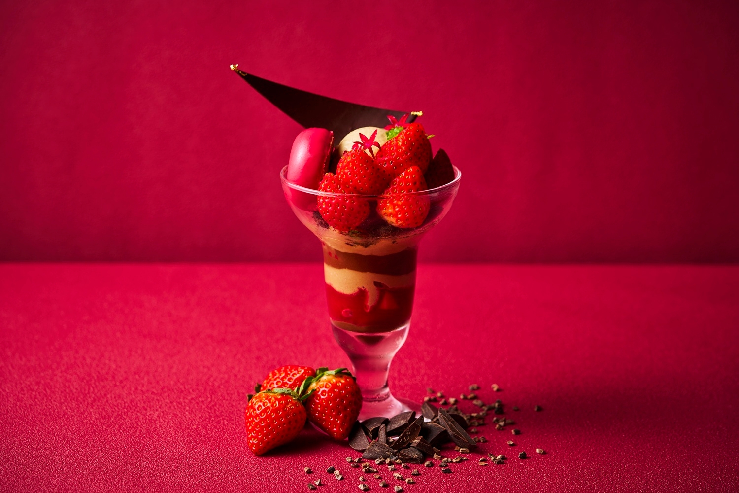 ラム酒香るチョコレートやコーヒーピーナッツのジェラート、旬の苺を贅沢に重ねた一品。口の中でふんわりと余韻が広がる、大人のためのご褒美パフェです。