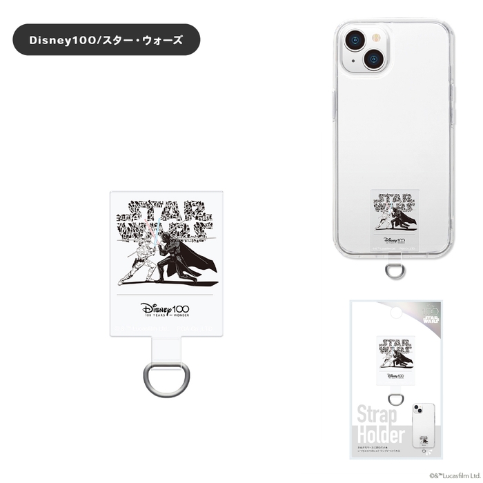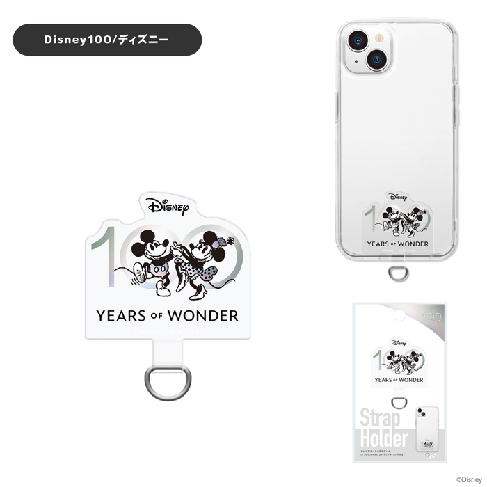 ディズニー100にインスパイアされたデザインのストラップホールのないケースに挟むだけでストラップが付けられるダイカット ストラップホルダーです。端末とケースの間にストラップホルダーを挟み込むだけで、ストラップホールを付加します。(※お手持ちのケースや充電口の形状によってはホルダーが収まらない場合があります。)端末やケースに貼り付けしないので、汚れずいつでも付け外しが可能です。