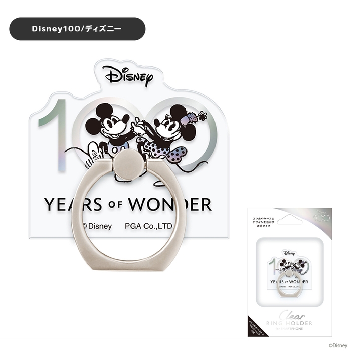 ディズニー100にインスパイアされたデザインのスマートフォン用 クリアリングホルダーです。スマートフォン本体やケースの背面に貼り付け、指を通すことで、端末の持ちやすさがアップし、落下防止の役割も果たしてくれます。360度回転するリングは動画視聴などに便利なスタンドとして使用も可能です。ガラス素材にも貼れる下貼りフィルムが付属されています。