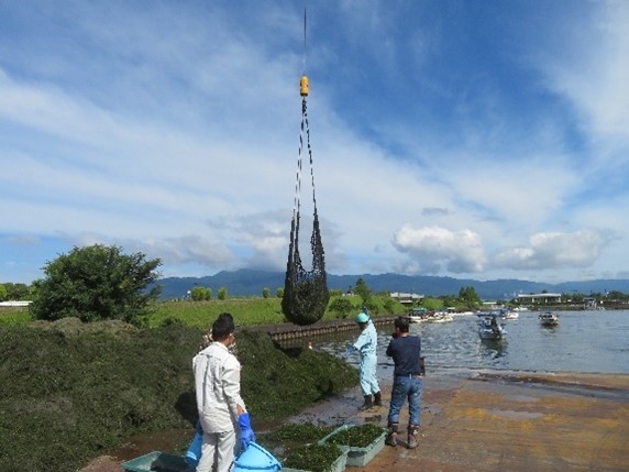 琵琶湖の水草はおよそ30年ほど前から大量に繁殖し、最近は年間150,000トンほど発生していると言われ、滋賀県では毎年6,000~7,000トン刈り取っています。水草類は含水率が90%以上あり、水から上げるとすぐに腐敗して悪臭を放ちます。これを滋賀県が1カ所に集めて3年かけて自然発酵させて堆肥化しています。